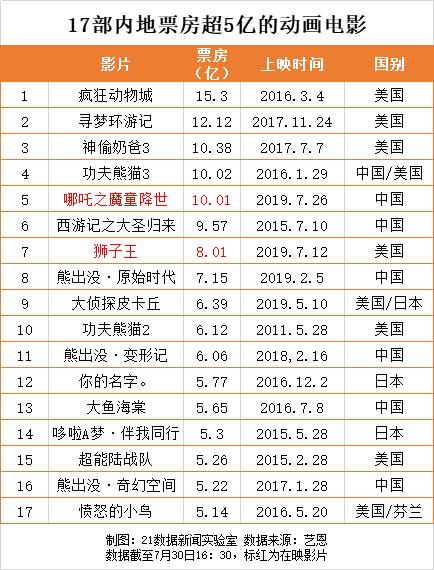 目前内地影史上票房超5亿的动画影片仅有17部。