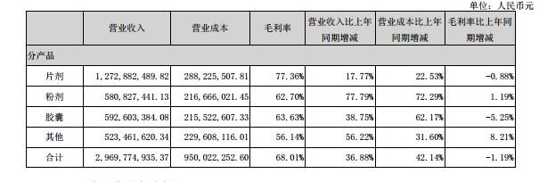 期内,公司营业成本约为9.5亿元,比上年同期增长42.14%;产品总体毛利率为68.01%,同比下降1.19%,其中片剂、粉剂和胶囊产品的毛利率分别为77.36%、62.70%和63.63%。