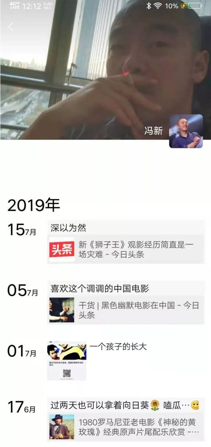 在他的微信朋友圈,有关电影的内容占据大半。冯鑫发的最后一条朋友圈是今年7月15日,对一篇名为“新《狮子王》观影经历简直是一场灾难”的文章进行了转载,并评论“深以为然”。