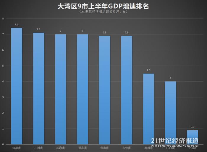 首先,不仅经济总量,上半年深圳和广州增速也分别位列第一、第二名,分别增长7.4%和7.1%。随后为珠海和肇庆,均增长7%;佛山和东莞也有同样增速,6.9%;惠州为4.5%,江门为4%,中山为0.9%。。