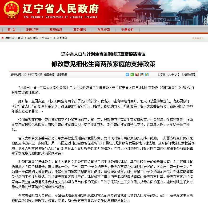 据辽宁省人民政府网站显示,7月29日,省十三届人大常委会第十二次会议听取审议《辽宁省人口与计划生育条例(修订草案)》。此次修订最突出的内容是拟减轻两孩家庭负担,降低社会抚养费征收标准。同时,除享受国家规定的产假外,增加产假60日,配偶享有护理假15日。