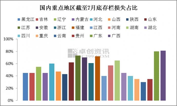 卓创调研结果显示,截止到7月底,全国生猪存栏损失量已近60%。各省生猪存栏损失均较重,尤其市场生猪交易活跃的省份,其中福建、苏皖及两广市场存栏损失均超70%,河北、山东、浙江及湖南市场存栏损失超60%。