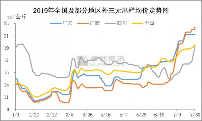 截至7月30日,广西外三元出栏均价为22.4元/公斤,较月初大涨8.4元/公斤,涨幅60.0%,一跃成为全国最高价区。