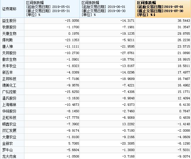 经过5月、6月份的回调后,养殖类上市公司7月份整体呈现反弹走势。涉及生猪业务的22家A股上市公司月度平均涨跌幅,从5月、6月的-7.3%、-10%转为7月份的12%。