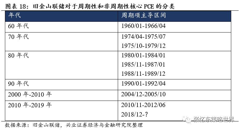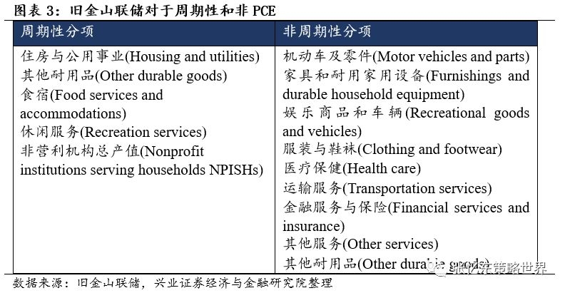 旧金山联储公布了PCE的周期性和非周期性的细项,周期性的细项即那些对于美国宏观经济状况相关的细项,非周期性细项则是和行业层面更相关。旧金山联储根据Mahedy-Shapiro方法,将满足菲利普斯曲线关系的细项划为周期性分类,不满足的则是非周期项,下表是细项分类结果。