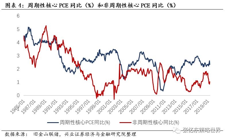 2010年以后周期项和非周期项的解释度差别缩小,非周期项较为明显的领先是17到18年间,周期项的急剧下降并没有阻挡PCE被非周期项抬升的势头。从我们的指标可以看出,非周期项18年年末至19年4月持续下行是美国当前低通胀的主要原因。由此,菲利普斯曲线效应并没有失效,周期性PCE随着2018年年底以来屡创记录的低失业率不断升高。核心PCE的下行仅仅由于正如鲍威尔所述的“临时性因素的拖累”。