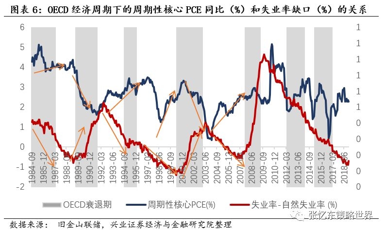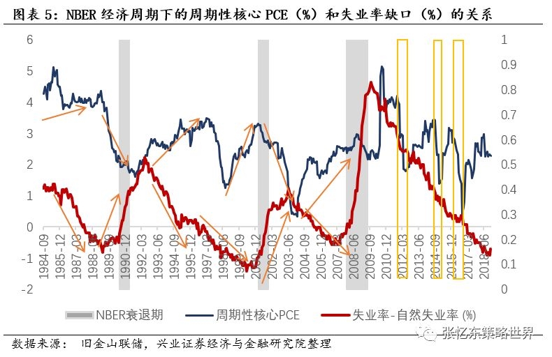 从周期项和失业率缺口的关系来看,08年金融危机前符合非常完美的菲利普斯曲线关系。08年之后失业率缺口不断地创新低,虽然大部分时间里周期PCE都在经历从低到高的爬升过程,但是中间会穿插急剧的下滑过程。分别发生在2012年,2014年年末和2016年。