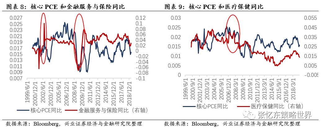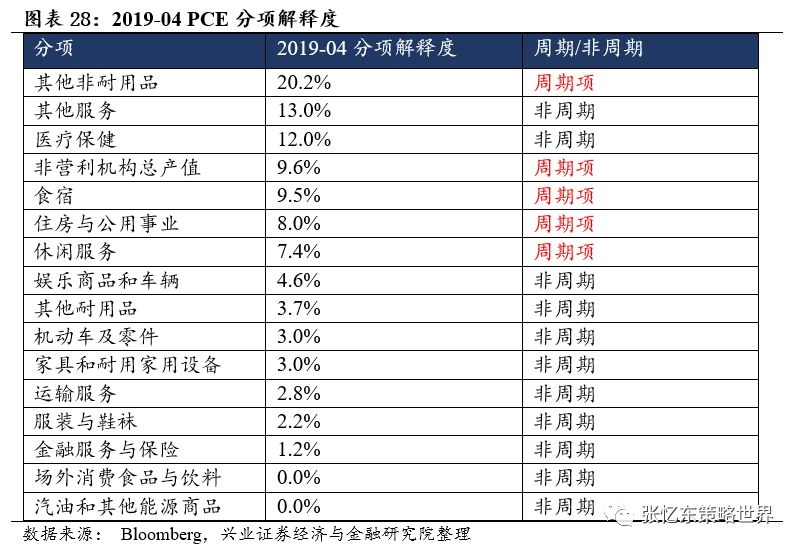 分项来看,截止最新(2019年4月)的核心PCE数据,“其他非耐用品”(周期项)的解释度在抬升,解释度高于20%,为所有分项里最高;解释度第二为“其他服务”(非周期项)2018年以来解释度出现明显的下滑;“医疗保健”(非周期项)于2018年平均解释度高达20%,居所有分项之首,其下滑程度最明显的时间是在2019年3月,当前解释度高达12%左右,为所有分项排第三。