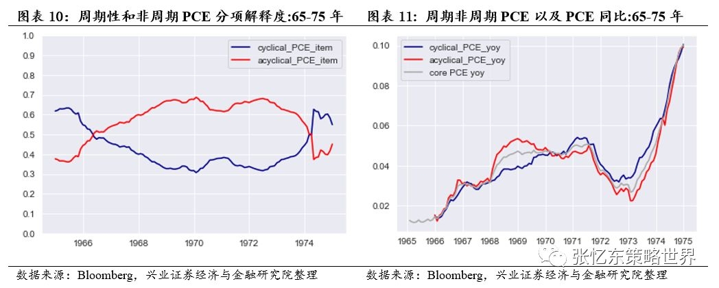 65年75年间周期性和非周期性PCE同比走势差别近似。图表10显示66年年末到74年年初的核心PCE同比由非周期项主导,图表11中可以看出,核心PCE同比(灰色线)和非周期(红色线)走势更为接近,如71年到72年、72年到73年的拐点走势。
