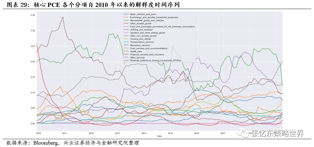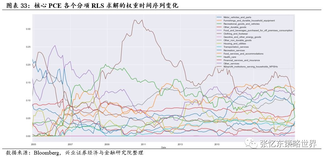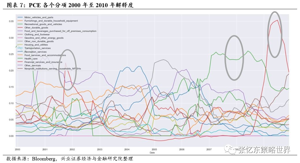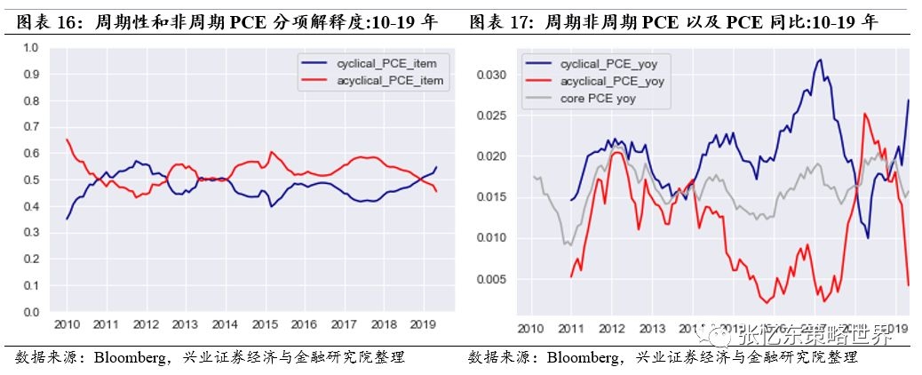 2.2、“解释度”指标的量化构建:假设PCE是各个分项的线性加权,我们基于PCE的时变波动性、协方差特征及权重构建了一个用来衡量PCE里每个分项对整体核心PCE的解释力的指标。历史上看,该指标很好地衡量了PCE的细项和合成的周期/非周期项对整体核心PCE的影响。