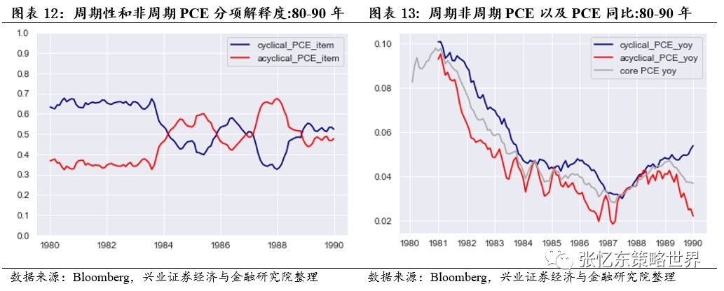 80年至90年呈现周期项和非周期项交替主导的情况,84年以前主要由周期项主导,随着83年年末至85年年末非周期项的波动放大,带动PCE同向震荡;86年至87年为周期项主导,导致在非周期项下行的情况下,PCE依然随着周期项的上行而上升;89年以后PCE下行,而周期项上行,此时虽然指标显示主导项为周期项,但是两者差异小。