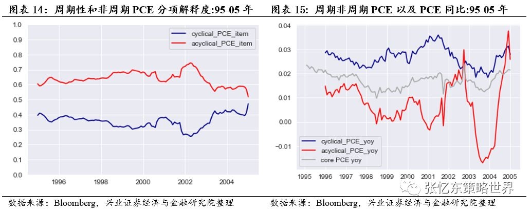 95年至05年间的PCE主要受到非周期项的主导,图表15便体现出出非周期项和PCE同比的诸多相关性,比如非周期项解释了核心PCE在01年和02年年末的急降急升。
