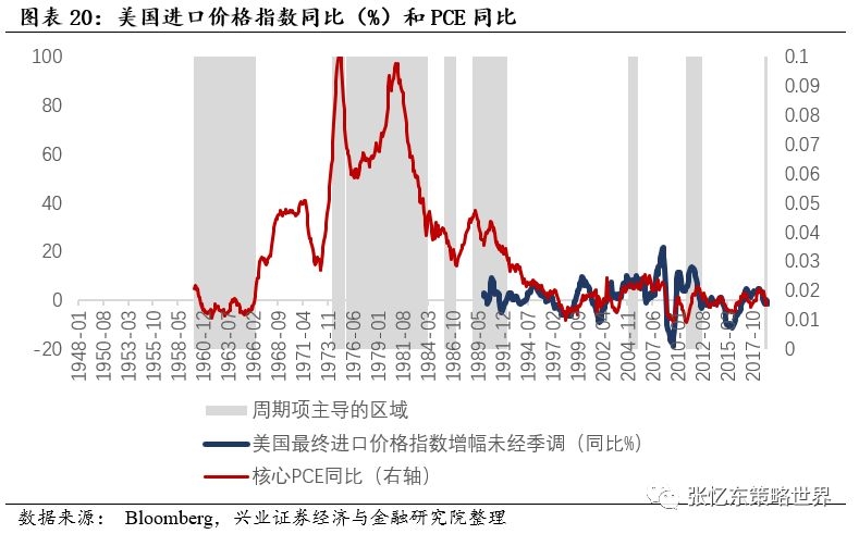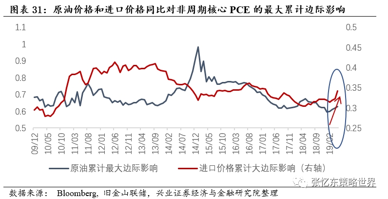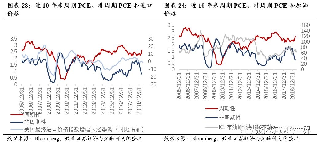 2.4、非周期PCE主要受到油价和商品价格的影响。长期来看,原油价格影响时间更长、累计影响程度更大,而进口价格影响则更迅速。2019年上半年美国从中国进口商品的输入性通胀压力被2018年年底的低油价所拖累。