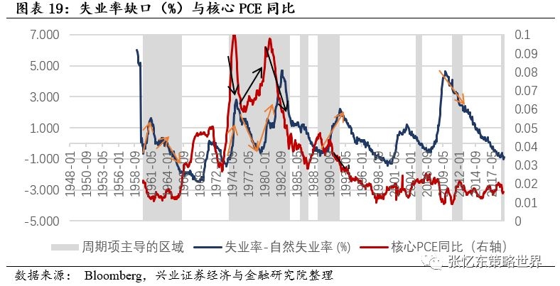 2)90年代至今的物价水平主要被非周期项所主导,这源于全球化进程加快、美国大量进口商品、以及美元走强等因,出现了低失业和低通胀并存的局面。3)2000年以后出现过三次周期因素主导通胀的情况,分别为2004/12-2005/10和2010/11-2012/06,最近一次是2018/12至今。
