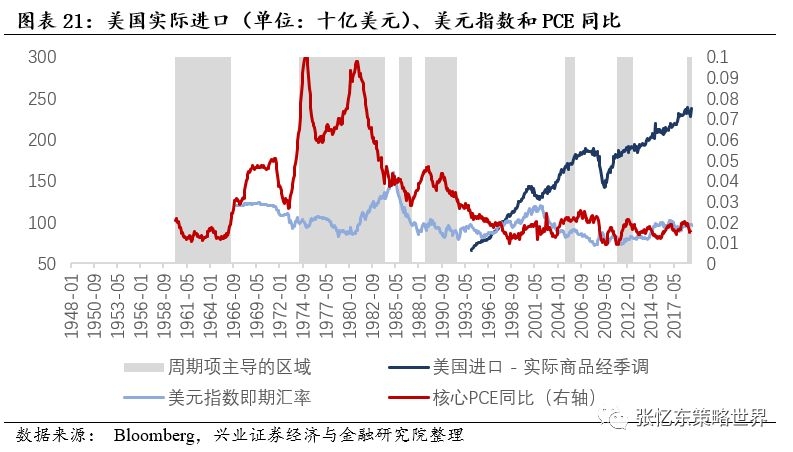 90年代以后由于全球化进程的加快,发展中国国家尤其是中国加大了对美国的廉价商品供给,物价走势逐渐被外生变量所主导。这些外生变量主要为:美元汇率、进口额和能源与原材料价格等。图表20反应了除周期性因素时间段外,90年代至今进口商品价格主导了核心PCE同比的走势。