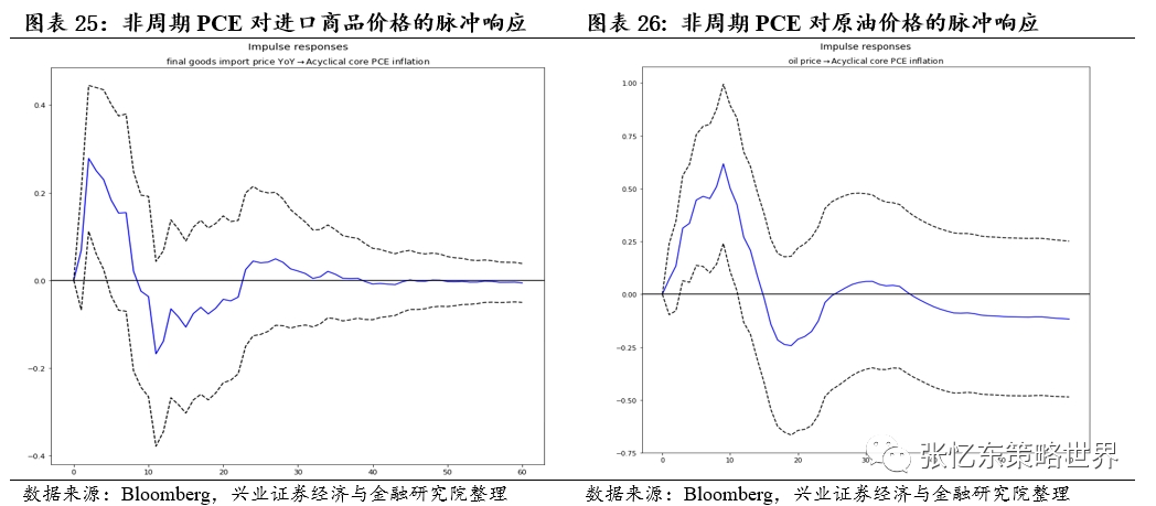 长期来看,进口商品价格和原油价格变动对非周期PCE的边际影响会持续2年以上;分别来看,原油价格上涨的边际影响在未来第9个月达到峰值后回落,而进口价格的影响在短期内则更加直接。图表25反应出当进口关税提高1单位,非周期PCE同比在接下来两个月快速升高,后逐渐回落收敛。