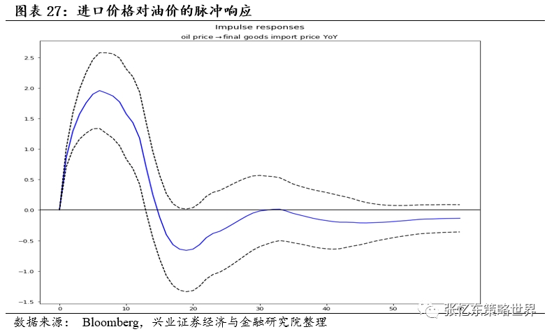 在强度上,原油价格对非周期PCE的影响程度峰值为0.6左右,大于进口价格不到0.3的影响峰值。部分原因是存在油价上涨通过带动进口商品价格上涨来间接影响非周期PCE的路径。油价上涨对进口商品价格的带动十分明显,如图27所示,经标准化后的原油价格上涨1,对进口商品价格的影响峰值为2,中间历时6个月。如果假设分布正太,即给一个以34%概率出现的原油价格偏离下限的正向冲击,6个月后会给进口商品价格造成概率为4%进口商品下限正向偏离!由此,2019年上半年美国从中国进口商品的输入性通胀压力被2018年年底的低油价所拖累。而商品价格的上升对未来原油价格的影响并不明显(见附录)。