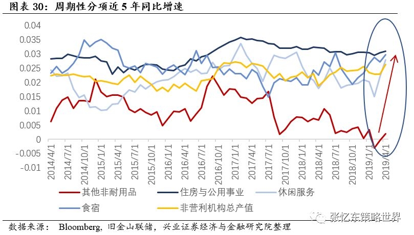 从周期项本身的数据来看,所有周期项在2019年年初都处在上行阶段,除了非耐用品,其他项在2019年04月同比增速都达2.6%以上,其中“住房与公用事业”同比超过3%。