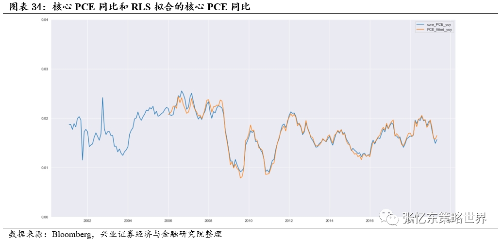 下图是核心PCE同比和通过RLS求解分项权重后的拟合核心PCE同比。蓝线是原始官方核心PCE,黄线是构造的核心PCE,可以看出拟合效果十分理想。