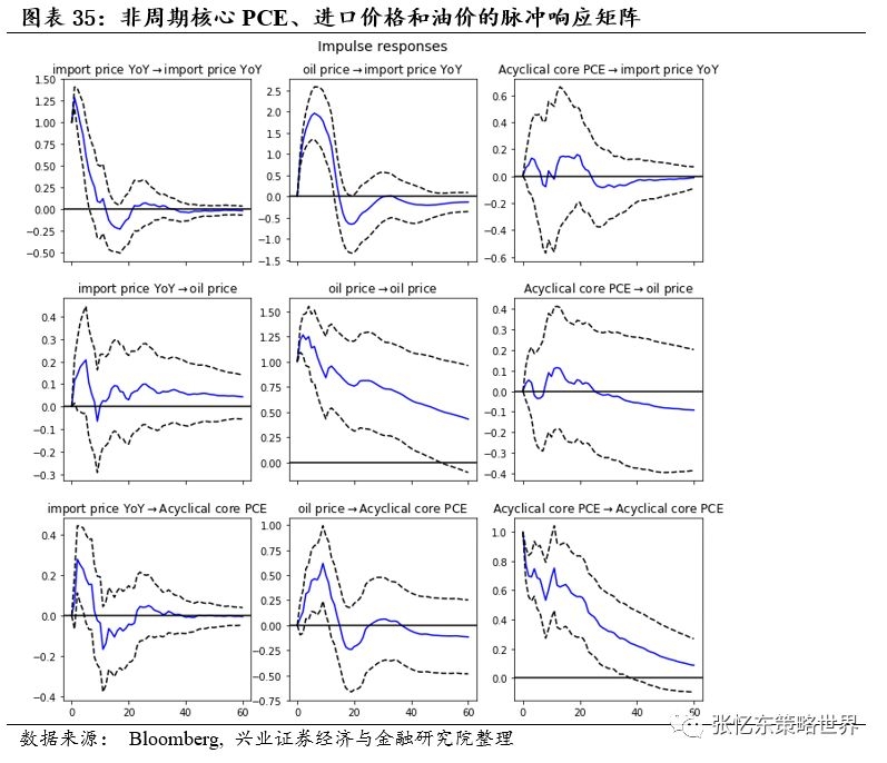 可以观察到非周期性核心PCE对进口商品价格和原油价格并不存在显著的影响,且进口商品对原油价格也没有显著的边际影响,结合正文中的结论,反映出原油价格为进口商品价格和非周期性核心PCE的“底层因素”,符合经济逻辑。