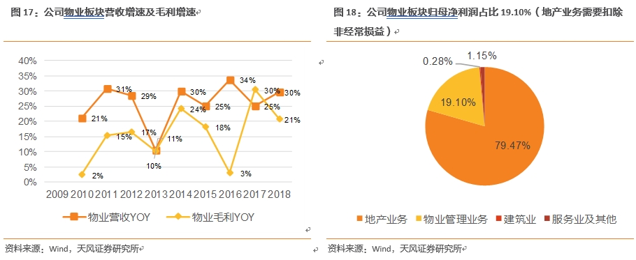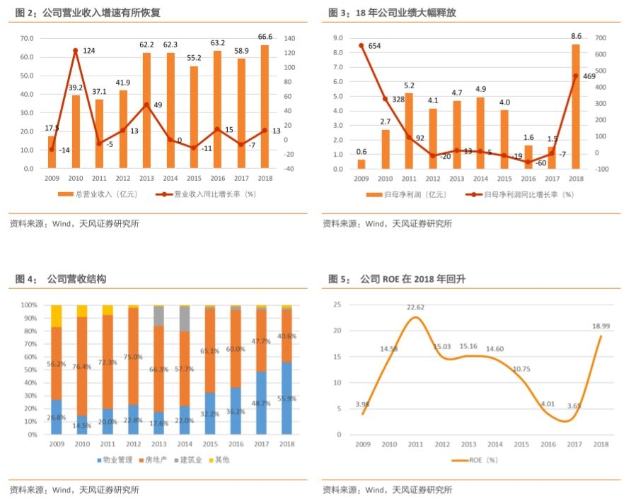 2018年公司实现营业总收入66.6亿元,同比增长13%,较2017年增速高出20个百分点,其中物业管理业务营收37.2亿元,占比56%,同比增长29.7%,较17年增速上升4.6个百分点。营收结构上,物业管理和房地产业务合计占比长期保持95%以上。17、18年公司物业管理业务不断发力,营收占比显著提升,2018年物业管理占比56%,较2017年上升7.2个百分点。