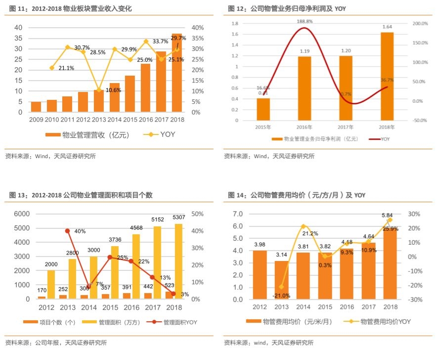 公司践行轻资产运行发展战略,物业管理面积和物业管理板块营业收入快速增加。公司未来主打现代服务业,资产结构将以“轻重并举,以轻为主”为方向,持续在物业管理板块加大投入。2012年以来,项目个数和物业管理面积不断迈上新台阶,管理面积复合增长率达到17.66%。同时,在物业管理板块的营业收入也快速增长,2017年物业板块的营业收入首次超越房地产板块,成为按产品划分营业收入中规模最大的一部分。截至2019年3月,公司物业管理面积6500万+平方米,全委托管理项目530多个。