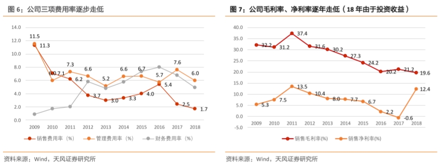 公司三项期间费用率不断下降。2018年公司销售费用率仅1.7%,同比下降0.8个百分点,较近5年来的峰值16年5.4%下降3.7个百分点。管理费用率6%,同比下降1.6个百分点。财务费用率4.9%,同比下降1.9个百分点,较16年峰值下降3.1个百分点。