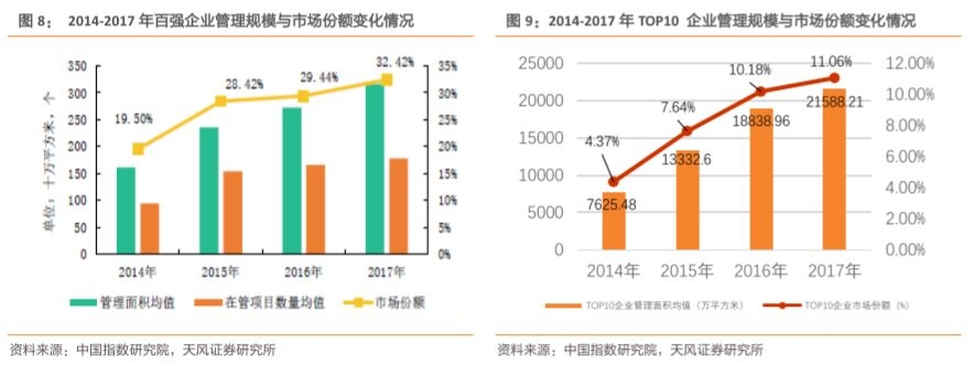 根据中国物业管理协会统计,2017年全国物业管理行业总面积246.65亿平方米,三年复合增长率达12.01%;全国物业服务企业数量达11.8万家,复合增长率3.97%。其中,百强企业顺应市场发展,坚持规模化扩张,巩固区域内优势地位,实现管理规模新一轮增长。2017年,百强企业管理面积均值达3163.83万平方米,同比增长16.1%,市场份额持续走高,达 32.42%,较上年提高2.98个百分点,增幅高于2016年,行业集中度进一步提升。TOP10 企业在规模化的道路上加速前行,2017年管理面积均值超过2亿平方米,同比增长14.59%;市场份额为11.06%,与2016 年相比提高0.88个百分点,强者恒强态势延续。