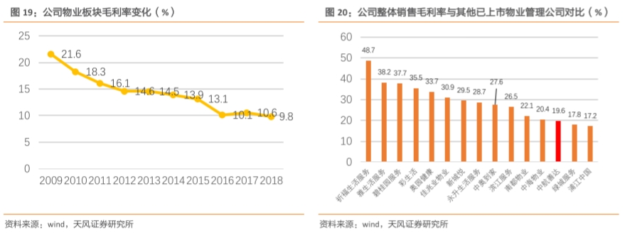 公司物业板块毛利2017年、2018年增速分别为30.41%和20.79%,增长较为迅速。目前物业板块营收占总营业收入比重已达55.87%,但物业板块净利润占总利润的比重为19.10%。主要由于物业板块毛利率低位有关。