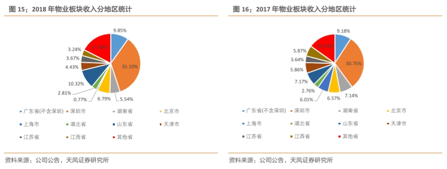 从分地区的营收来看,公司在广东省尤其是深圳有较强的竞争力,2018年物业板块深圳市营收占到物业板块总营业收入的35.10%,相较于2017年的30.75%提升了4.35个百分点。