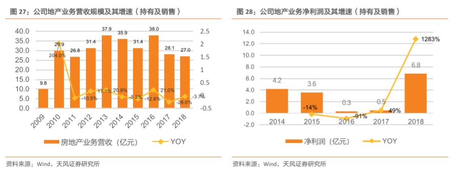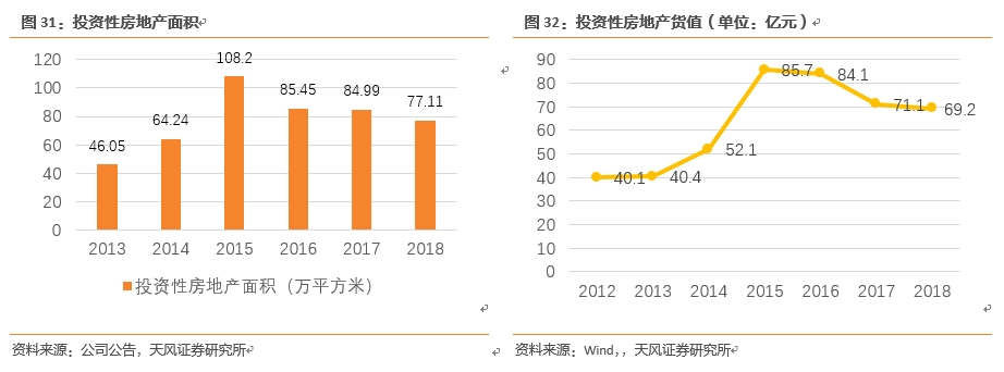 2017、18年开始随公司地产项目逐渐出售,地产营收规模逐渐缩减。2016年大量项目出售,导致2017年公司营收大幅缩减。2016年公司出售股权项目9个,出售资产项目1个,交易对价总计22.4亿元,获取投资收益共计3.79亿元;2018年公司出售股权项目4个,交易对价总计24.39亿元,获取投资收益共12.43亿元。两轮出清后,公司销售型物业几近出清。在手项目仅剩4个,其中衡阳中航还剩50万方待开发土储、以及天津九方广场在施工中,预计年内新增贡献较少。