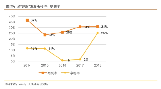 2018年公司实现归母净利润8.6亿元,同比增长469%,其中物业管理业务贡献1.6亿元归母净利润,占比19.1%。业绩猛增的重要原因是2018年公司转让子公司股权(中航城置业(上海)有限公司、贵阳中航房地产开发有限公司、惠东县康宏发展有限公司)确认投资收益12.5亿元,占营业利润的102.4%,不具有可持续性,扣除投资收益后的净利润约为-0.1亿元,较17年净利润-0.35亿元回升71%。