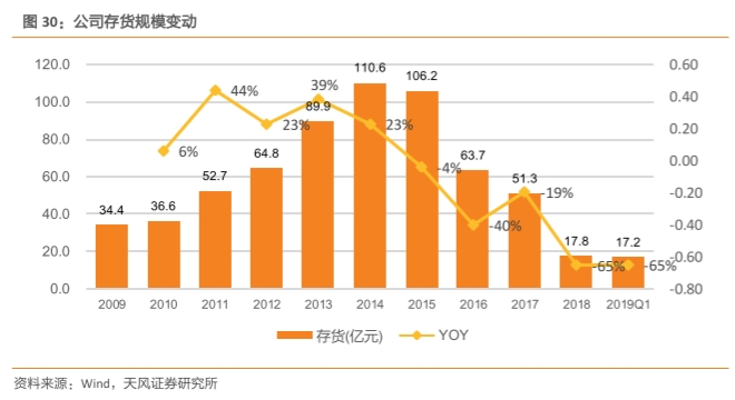 2018年末存货金额为17.8亿元,较年初存货51.3亿元减少了33.5亿元,带息负债48.3亿元,较年初78亿元减少29.7亿元,资产负债率也下降至63.1%。资产结构得到进一步优化,提高资产运行效率和效益,更好的匹配了公司转型战略。