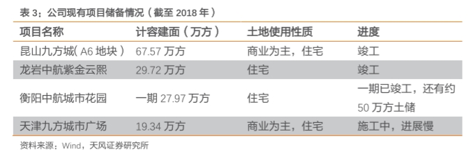 截至2018年报公司还有房地产开发项目包括昆山九方城(A6地块)、龙岩中航紫金云熙、衡阳中航城市花园及天津九方城市广场项目。昆山九方城(A6地块)、龙岩中航紫金云熙及衡阳中航城市花园一期均已竣工验收,目前处于销售尾盘,其中衡阳中航城市花园项目尚有土地储备近50万平米;天津九方城市广场地下部分已完成施工,因所在区域尚未成熟,开发进度较慢。