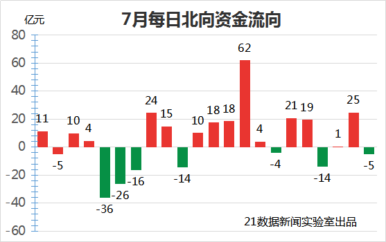 尽管A股7月整体下行,但北上资金连续第二个月净流入,单月累计净流入120.25亿元。尤其科创板上市前一个交易日,北上资金疯狂净流入61.89亿元。据21数据新闻实验室统计,五粮液(000858.SZ)、中国平安(601318.SH)、海康威视(002415.SZ)等为北上资金“买买买”的主要对象。