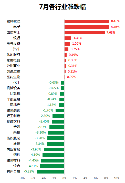 从行业来看,28个申万一级行业中,10个行业飘红,农林牧渔、电子涨幅接近10%,有色金属走的最糟糕,当月跌幅达5.32%。