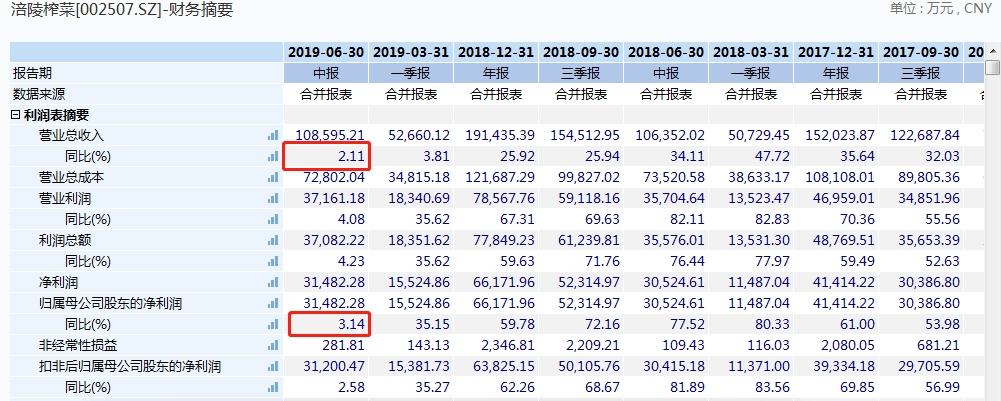 尽管上半年数据仍在增长,但在增长速度上,尤其是今年第二季度的增速上,涪陵榨菜的业绩水平已较去年同期明显下滑。