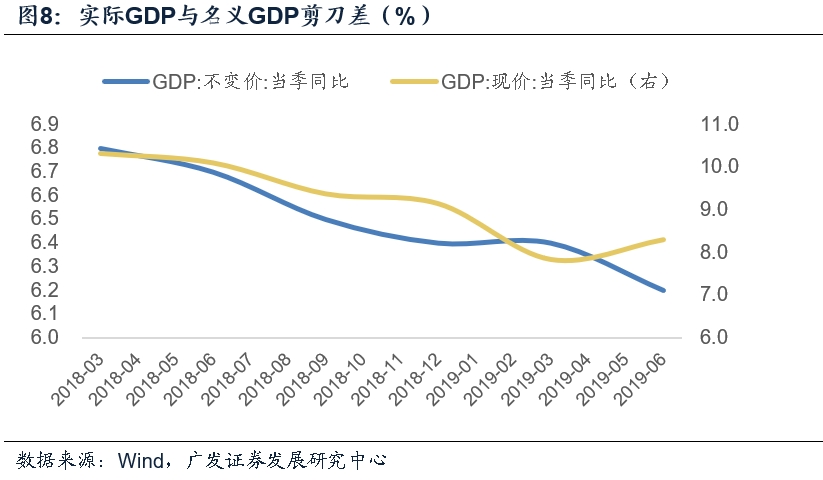 如果我们将2019年以来的库存周期走势切换为美林时钟视角,则整体是微衰退周期,同时Q2一定程度上出现了微滞胀。我们在前期报告《宏观经济的七个关键问题》中指出,货币供给推动建筑产业链和上游价格(名义增长);信用二元化环境下货币继续向下传递受阻、出口产业链拖累实际需求(实际增长)。名义GDP增速上升,实际GDP增速下降,二季度资产定价偏微滞胀环境。所以同期股票、债券表现均不算太好。