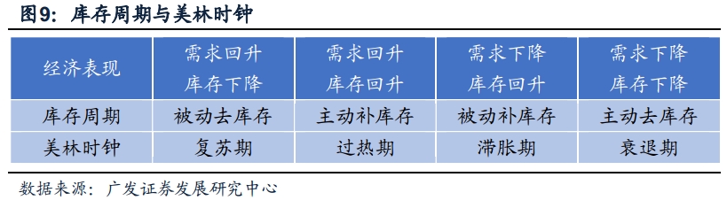 若切换为美林时钟视角就是:微衰退周期,夹杂Q2一定程度的微滞胀,所以不难理解同期股债表现。我们知道,库存周期与美林时钟的核心思想是一致的,都是用量和价双坐标来描述经济阶段。其中“主动去库存”大致对应“衰退期”,“被动去库存”对应“复苏期”,“主动补库存”对应“繁荣期”,“被动补库存”对应“滞胀期”。