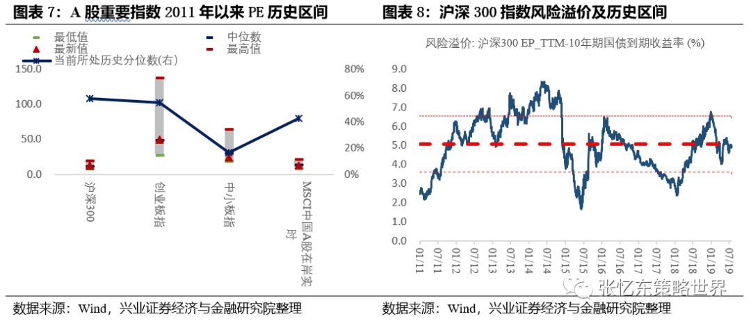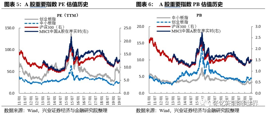 当前沪深300、创业板、中小板和MSCI中国A股在岸指数的PE(TTM)分别为12.4、50.1、24.8和12.5倍,处于2011年58%、55%、17%、43%分位数水平;PB分别为1.50、4.58、3.29和1.48倍。