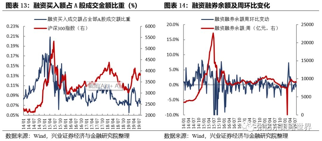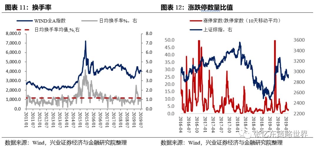 本周日均换手率为0.79%,低于2011年以来的平均水平;涨停家数/跌停家数(10日移动平均)为2.73;融资买入额占全部A股成交金额比重为0.77%,较上周略有下降,处于2014年以来的低位水平;融资融券余额9087亿元人民币,较上周环比下降0.19%。