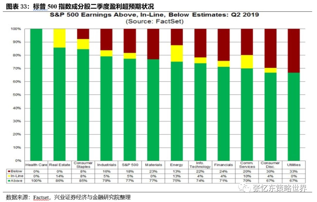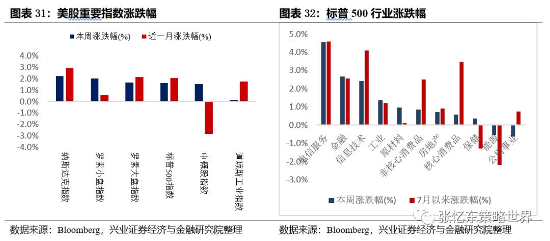二季度业绩超预期是本周美股重要的驱动力。标普500指数中44%的公司发布Q2业绩,其中77%的公司EPS超预期,推动标普500及纳斯达克指数创新高。