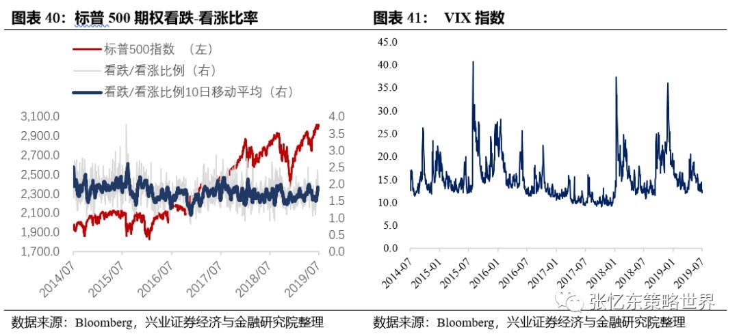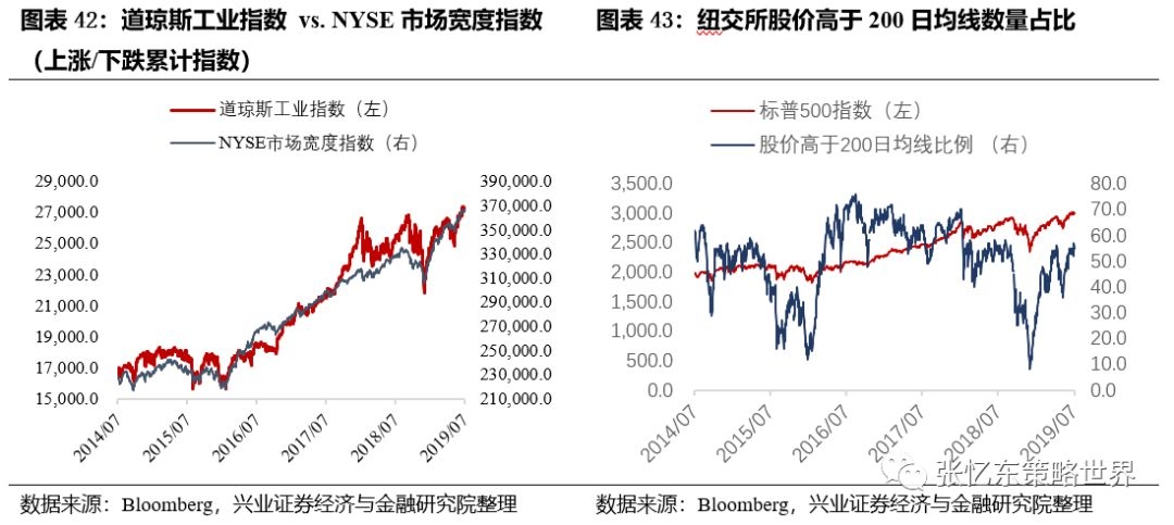 当前VIX指数处在低位水平,纽交所市场宽度指数上行,股价高于200日均线占比继续抬高,反应了美股依然具有较强的动量。
