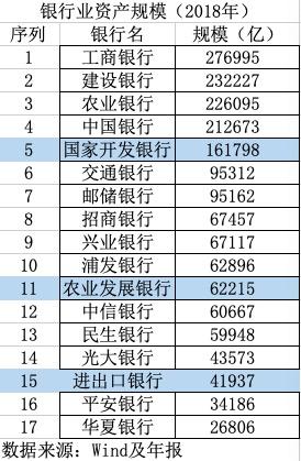 数据显示,截至2018年末进出口银行资产规模4.19万亿,首度超过4万亿。资产规模在银行业居第十五位,其体量和光大银行相当。国开行资产规模则高达16.17万亿,农发行资产规模为6.22万亿(2018年尚未披露年报,数据为2017年)。