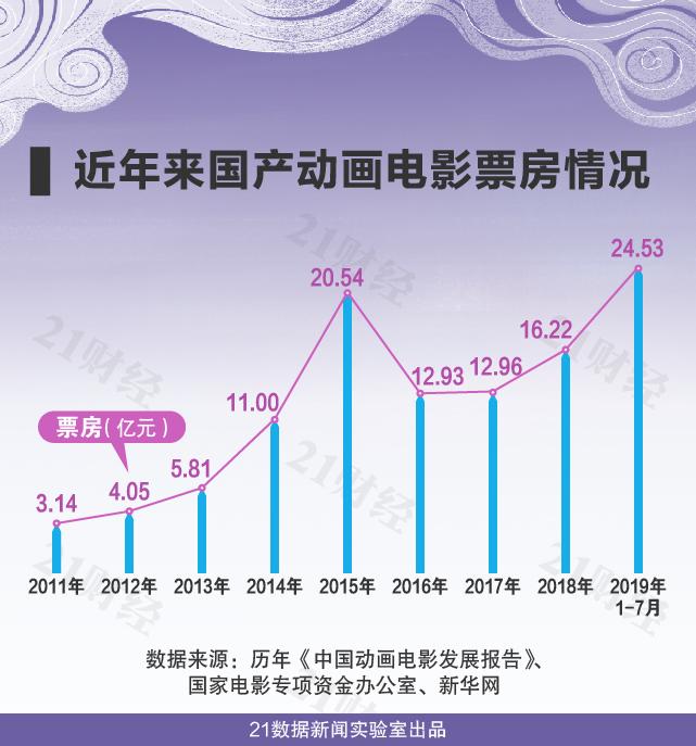 在经历2018年票房不佳后,2019年以来,国产动画电影票房逆势爆发。今年初,成人向动画电影《白蛇缘起》票房达到4.5亿元;8月1日,据猫眼数据显示,《哪吒》上映第7天,累计票房已突破13亿元,登顶国产动画电影票房之最。因《哪吒》的大热,2019年前7个月国产动画电影票房超过24亿元,创历史新高。
