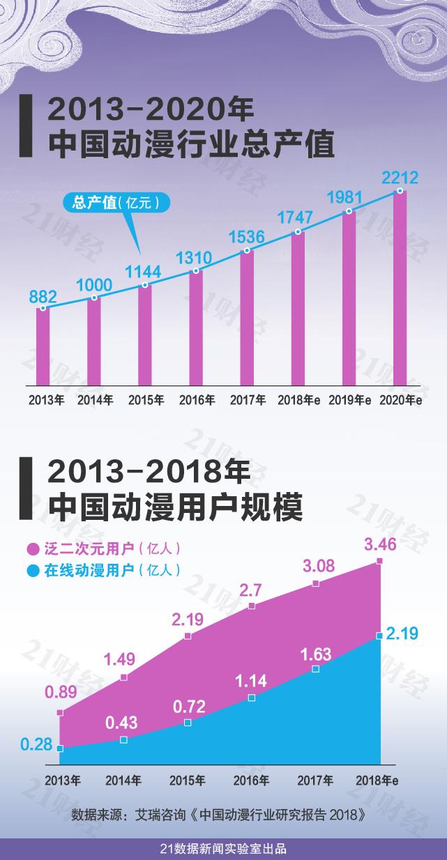 据《中国动漫行业研究报告2018》显示,中国动漫行业总产值超过1500亿元。2018年中国的泛二次元用户规模将近3.5亿,在线动漫用户规模超过2亿。