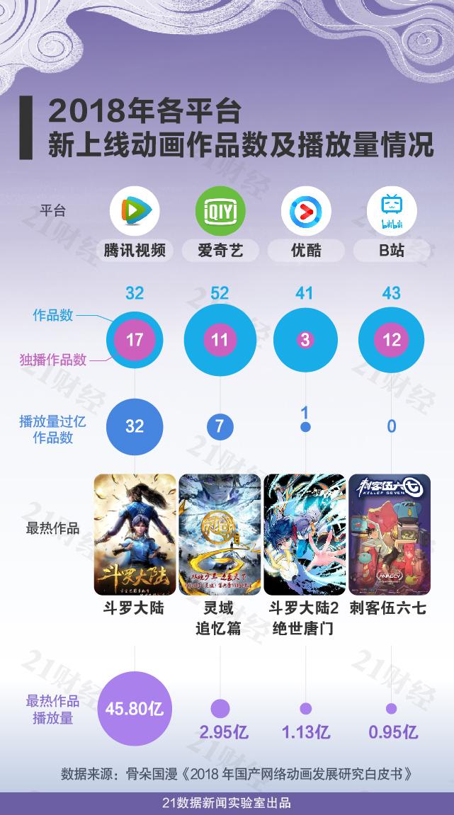 以网络动画播出平台为例,巨头腾讯一枝独秀。2018年,腾讯视频新增动漫作品32部,值得注意的是,这32部作品播放量全部过亿。其中,最热作品《斗罗大陆》以45.8亿的播放量遥遥领先。