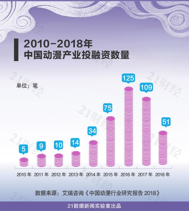 补贴政策逐渐退出后,随着对盗版作品的打击与知识产权的保护力度的加强,动漫产业公司开始大量受到资本的关注,2016年动漫产业的投融资达到125笔的高峰,之后投资有所下滑,2018年投融资仅有51笔。