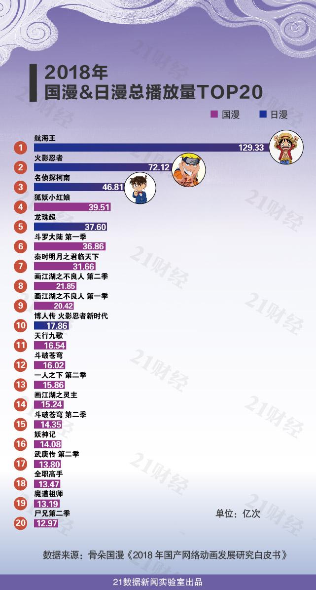 数据显示,2018年各网络平台动画片播放排行中,虽然前3名仍为日漫,但《航海王》、《火影忍者》、《名侦探柯南》已经属于日漫老IP。