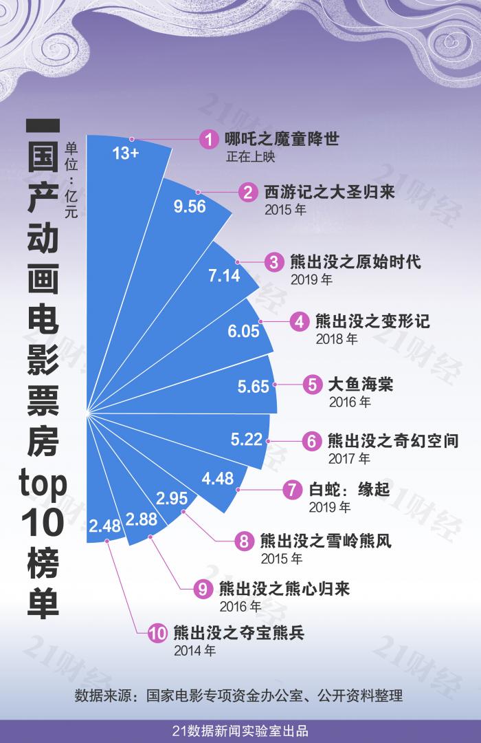 有趣的是,在国产动画电影票房top10排行中,儿童向的《熊出没》系列动画电影占得6席。众所周知,国产动漫低龄化问题一直受人诟病,而全龄向动画电影《哪吒》的诞生,或有助于扭转这种局面。
